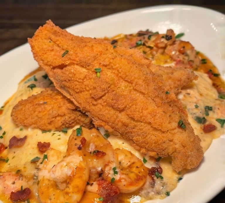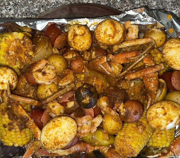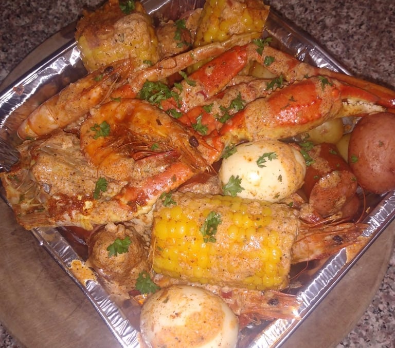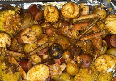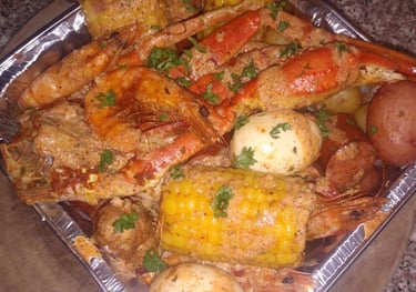A seafood feast! Tender crab and catfish are boiled with bold spices, corn, potatoes, and sausage for a hearty, flavor-packed experience. Perfect for sharing—or indulging all to yourself.