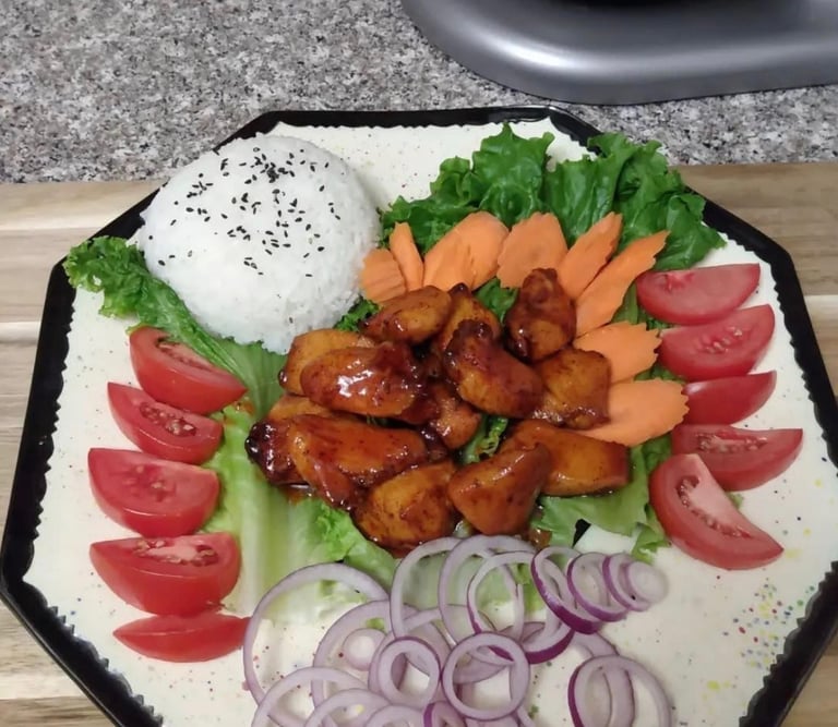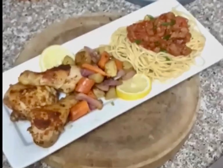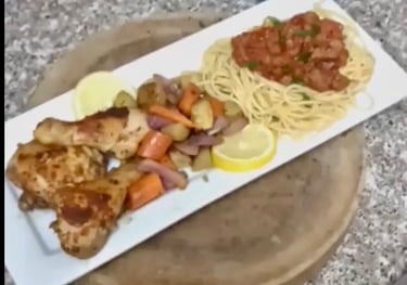 Perfectly seasoned, golden roasted chicken served alongside a medley of tender, flavorful vegetables. A wholesome, satisfying meal that’s both comforting and delicious.
