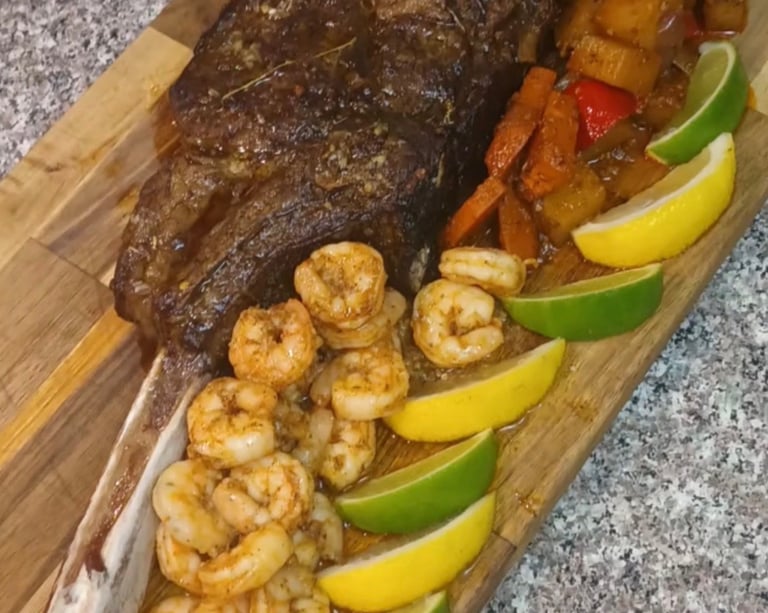 A show-stopping, bone-in ribeye cooked to perfection, juicy and packed with rich, savory flavor. Perfect for steak lovers craving a hearty, indulgent meal.