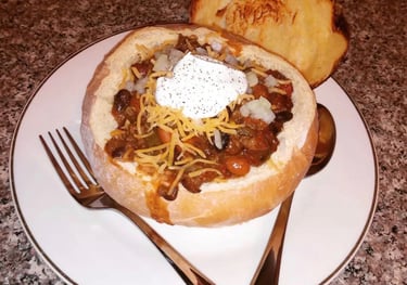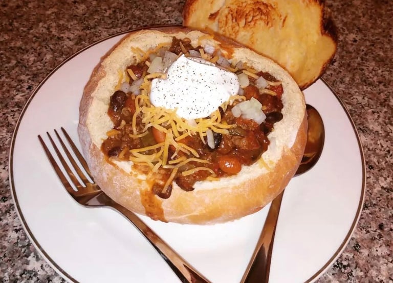 Hearty, slow-cooked chili served in a warm, crusty bread bowl that soaks up every rich, savory bite.