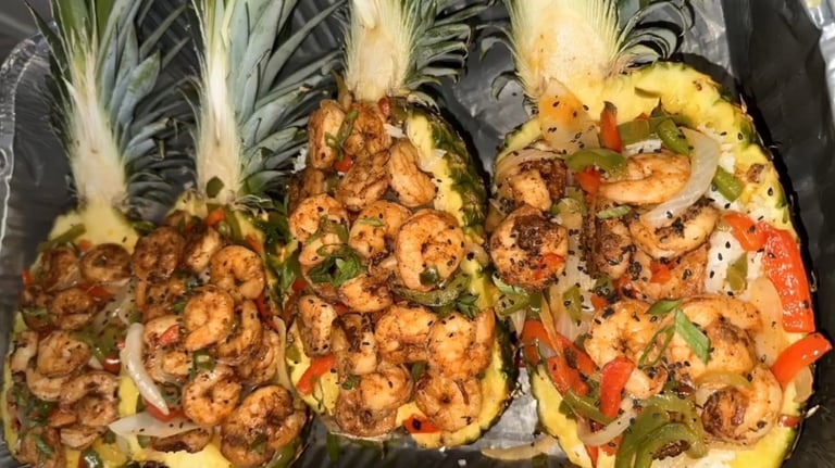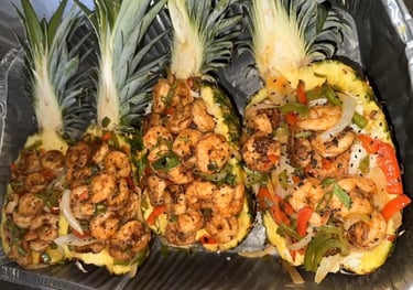 Fresh, juicy pineapple halves filled with a flavorful mix of tropical fruits, your choice of savory or sweet toppings, and a hint of zesty flair for a dish that’s as vibrant as it is delicious.